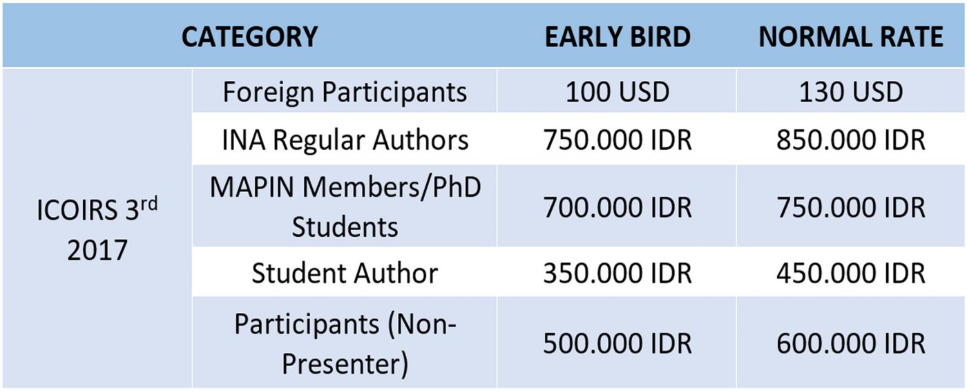Tour fee is IDR 400,000.00 per person (please see the registration form for payment method options). Please register to our ICOIRS 2017 Central Java Tour Registration Form as soon as possible : http://bit.ly/ICOIRS2017